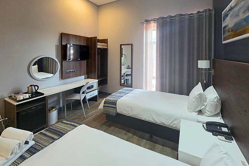 The hotel accommodates 2 guests per room. Each room is furnished with an en-suite bathroom, air conditioning, a work desk, a safe, complimentary Wi-Fi, and tea and coffee making facilities. Accessible rooms suitable for wheelchair users are also available.
